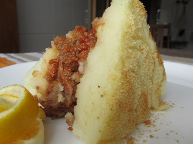 Cozer as batatas em água e sal. Retirar a água e esmagar as batatas. Adicionar o leite, a manteiga e a noz moscada. Levar ao lume e mexer durante 4 minutos, reservar. Num tacho fazer um refogado com a cebola , folha de louro,azeite, rodela de chouriço e o alho. Adicionar a carne, o sal e mexer até ficar cozinhada. Juntar o tomate, o vinho e deixar a cozinhar até apurar e reduzir o molho. Num recipiente que possa ir ao forno colocar metade do puré de batata, uma camada de carne picada e terminar com o restante puré. Polvilhar com pão ralado e leve ao forno (180ºC)até ficar dourado.