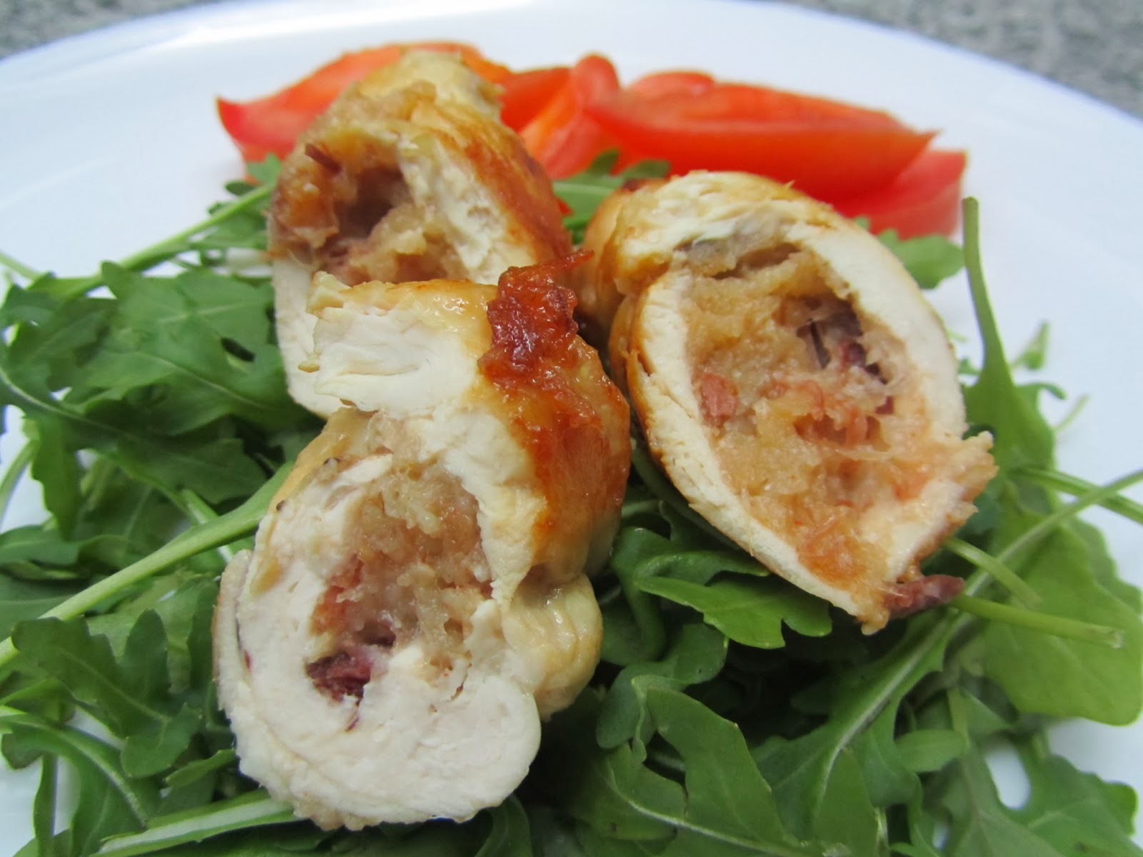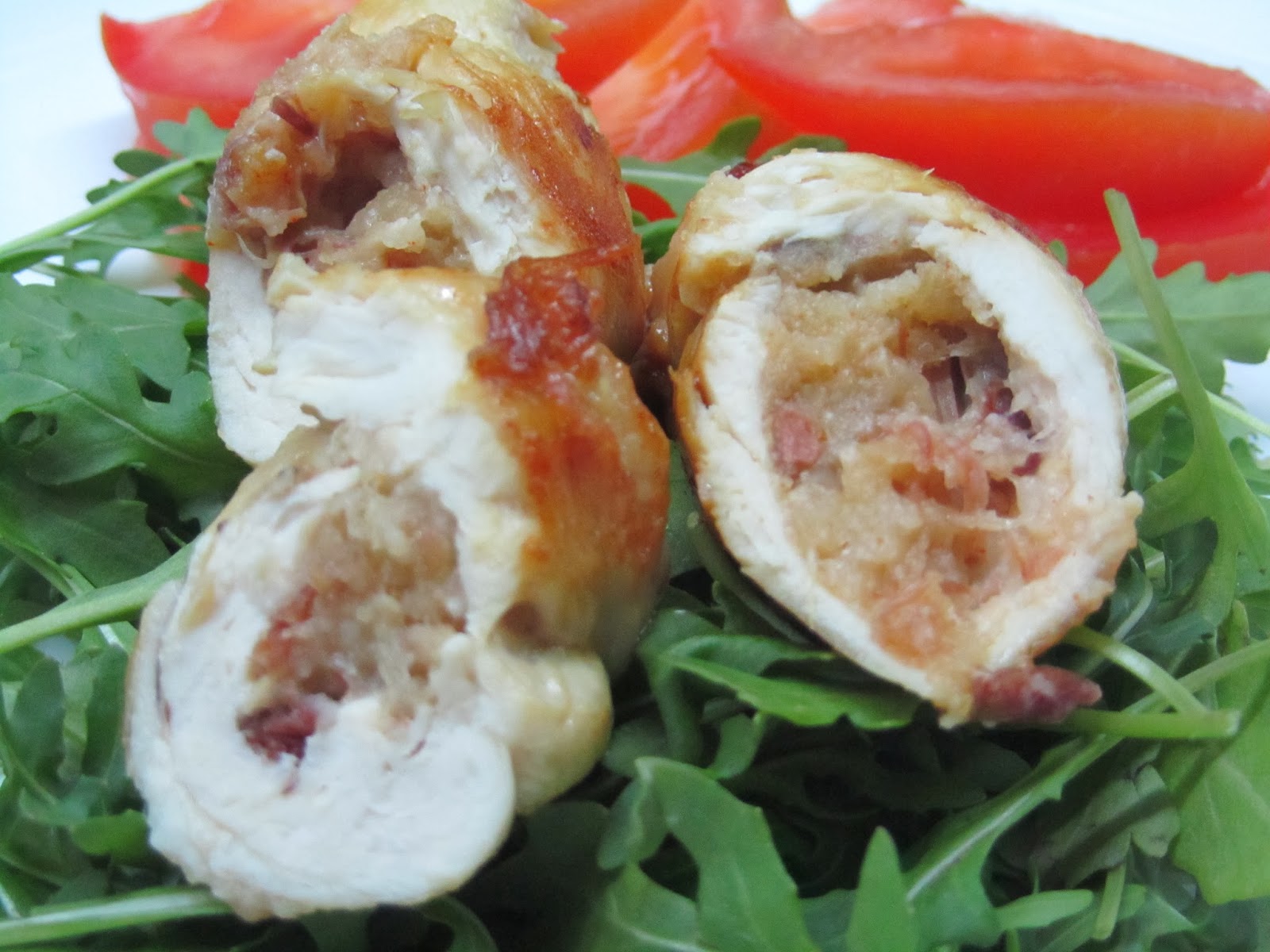 Temperar os bifes com uma pitada de sal e pimenta (colocar pouco sal porque a alheira vai impregnar o bife com o seu sabor salgado), colocar a alheira ao longo dos bifes, enrolar e atar com fio. Aquecer o azeite numa frigideira e cozinhar os bifes até ficarem douradinhos. Na hora de servir cortar os fios que envolveram os bifes e parti-los ao meio. Acompanhei os bifes com uma salada de rúcula e tomate.