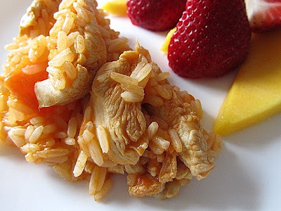 Faça um refogado clarinho com o azeite, cebola , folha de louro e alho(em lume brando). Adicione o tomate cortado em pedaços e deixe-o cozinhar 5 minutos. Refresque com o vinho verde e deixe ferver 2 minutos. Adicione o peito de frango cortado em tiras, rectifique de sal e deixe estufar na calda durante 15 minutos. Adicione água suficiente para cozinhar o arroz(2 chávenas de água para cada chávena de arroz). Habitualmente, acompanho sempre a refeição com saladas, legumes ou frutas. Neste prato, coloquei morangos e manga.