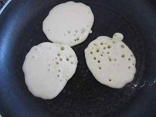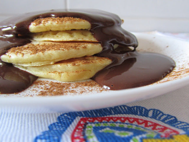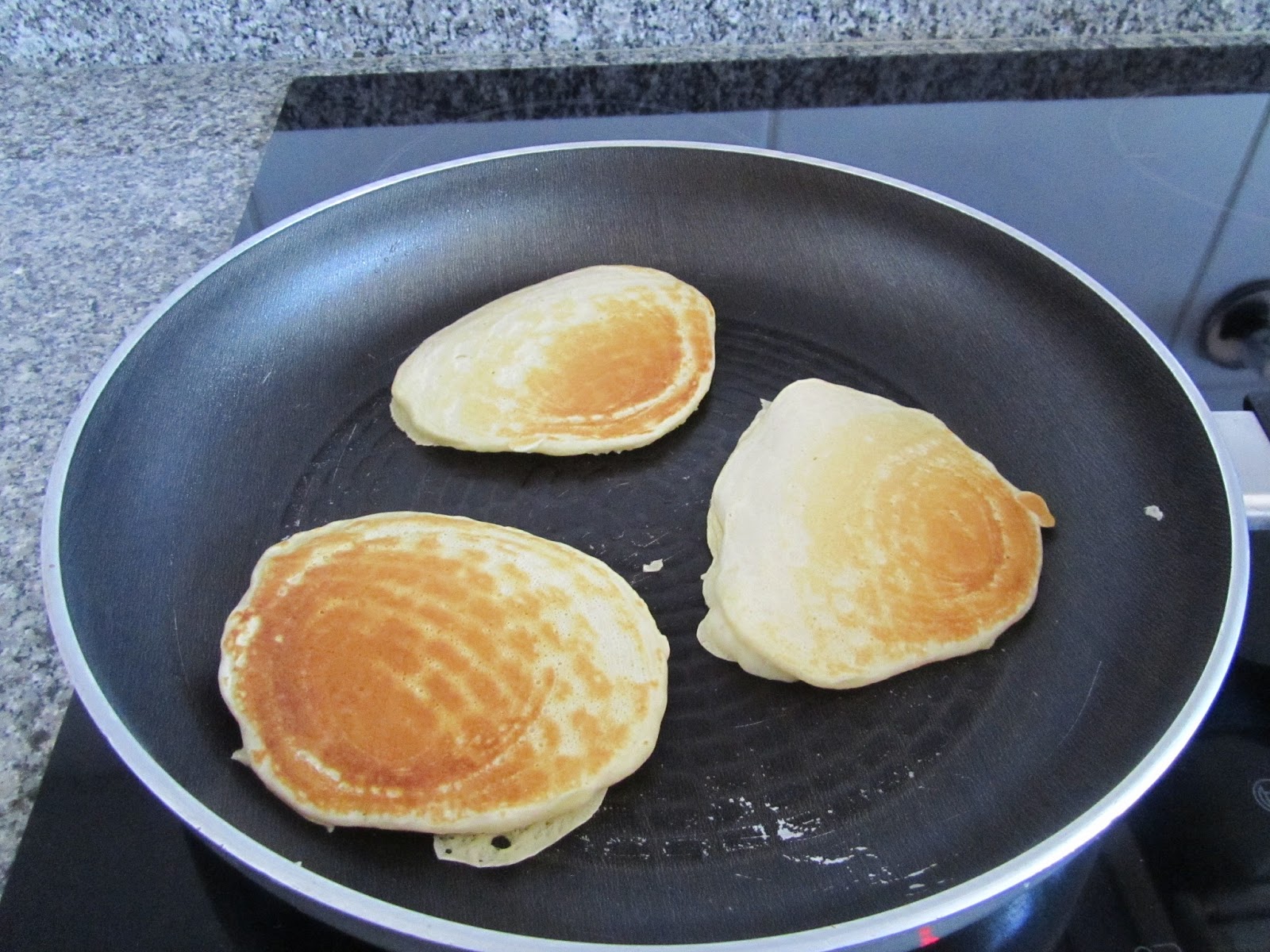 Bata todos os ingredientes até obter uma mistura homogénea e sem grumos. Aqueça bem uma frigideira anti- aderente (como não tenho a frigideira especial para panquecas, improviso e uso a do vulgar trem de cozinha; quem me costuma visitar já reparou que eu não tenho equipamento sofisticado!) , deite umas gotas de óleo (uso de amendoim ) e de seguida limpe com um guardanapo de forma a não se veja a gordura (repita esta operação sempre que necessário). Coloque pequenas quantidades de massa no meio da frigideira e deixe-as escorrer até ao extremo (assim forma pequenos círculos). Quando começar a formar bolhas por cima da panqueca, vire-a e deixe-a cozinhar mais uns 20 segundos. Podemos decorar as panquecas no prato de diversas formas, cá em casa gostamos de colocar canela, molho de chocolate quente e uma bola de gelado ou canela e molho de chocolate quente ou compota de morango ou simplesmente com canela!!!!