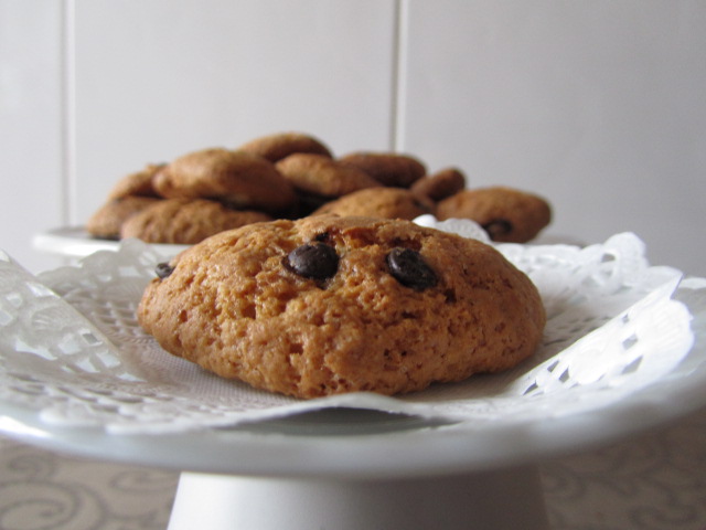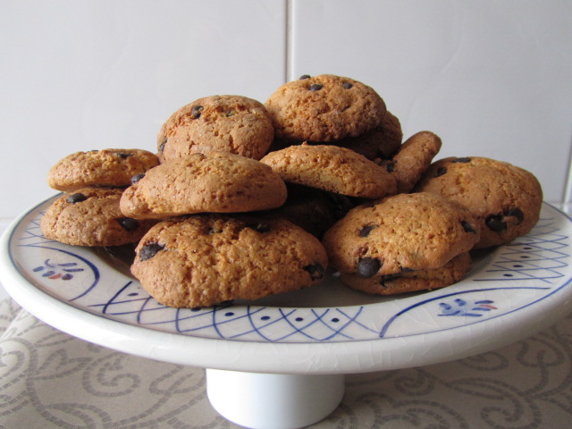 Num recipiente misture todos os ingredientes excepto o chocolate, até formar uma bola. Adicione o chocolate e misture mais um pouco. Com a mão faça pequenas bolas e espalme-as com os dedos (pode ser necessário polvilhar as mãos com farinha para fazer as bolas). Coloque-as em tabuleiro forrado com papel vegetal e leve ao forno a 180ºC durante 15 minutos. Quando saem do forno parecem um pouco moles mas endurecem à medida que vão arrefecendo.