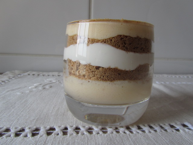 Separar as gemas das claras e bater as últimas em castelo. Levar as gemas e o leite condensado ao lume até engrossar (mexer sempre). Deixar arrefecer. Juntar à mistura anterior a folha de gelatina demolhada e derretida (no microondas durante 10 segundos), de seguida adicionar as claras em castelo. Bater as natas  até duplicarem de volume, adicionar o açúcar e a baunilha, batendo mais um pouco. Em taças, colocar camadas alternadas de bolacha moída, mistura de leite condensado e natas batidas. Leve ao frigorífico e antes de servir polvilhe com bolacha moída. Adaptei esta receita do blog bolinhodesabado.