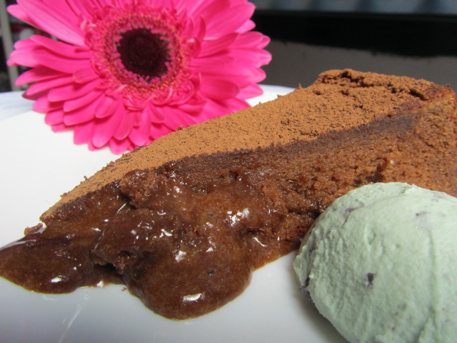 Pesar o açúcar. Bater as claras em castelo bem firme, adicionar 3 colheres de sopa do açúcar pesado e bater mais um pouco. Levar o chocolate com a margarina ao microondas durante 10 segundos . Bater as gemas com o açúcar e adicionar a mistura anterior. Adicionar a farinha e por fim as claras suavemente. Levar ao forno a 200º C durante 15 minutos (o palito deve sair seco nos bordos da forma mas fica liquido no centro), deve-se tapar a forma com papel vegetal. Deixar o bolo a arrefecer dentro da forma antes de desenformar. Polvilhar com cacau em pó antes de servir.  Como sou muito gulosa, servi o bolo com uma bola de gelado de menta.