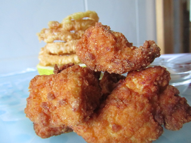 Num recipiente coloque o leite, ovo, sal, piri- piri, pimentão doce, gengibre, pimenta, tomilho e o frango partido em pedaços pequenos, deixando a marinar 24 horas no frigorífico.  Num saco plástico deite os três tipos de farinha, uma pitada sal e pimenta. Coloque os pedaços de frango escorridos dentro do saco plástico anterior e mexa bem para que fiquem com uma boa crosta de farinha. Deixe-os a repousar  no frigorífico pelo menos uma hora. Frite-os em óleo bem quente  até ficarem douradinhos (5 -6  minutos). Acompanhei estes pedacinhos de frango com anéis de cebola frita (irei colocar a receita brevemente), maionese, mostarda e ketchup.