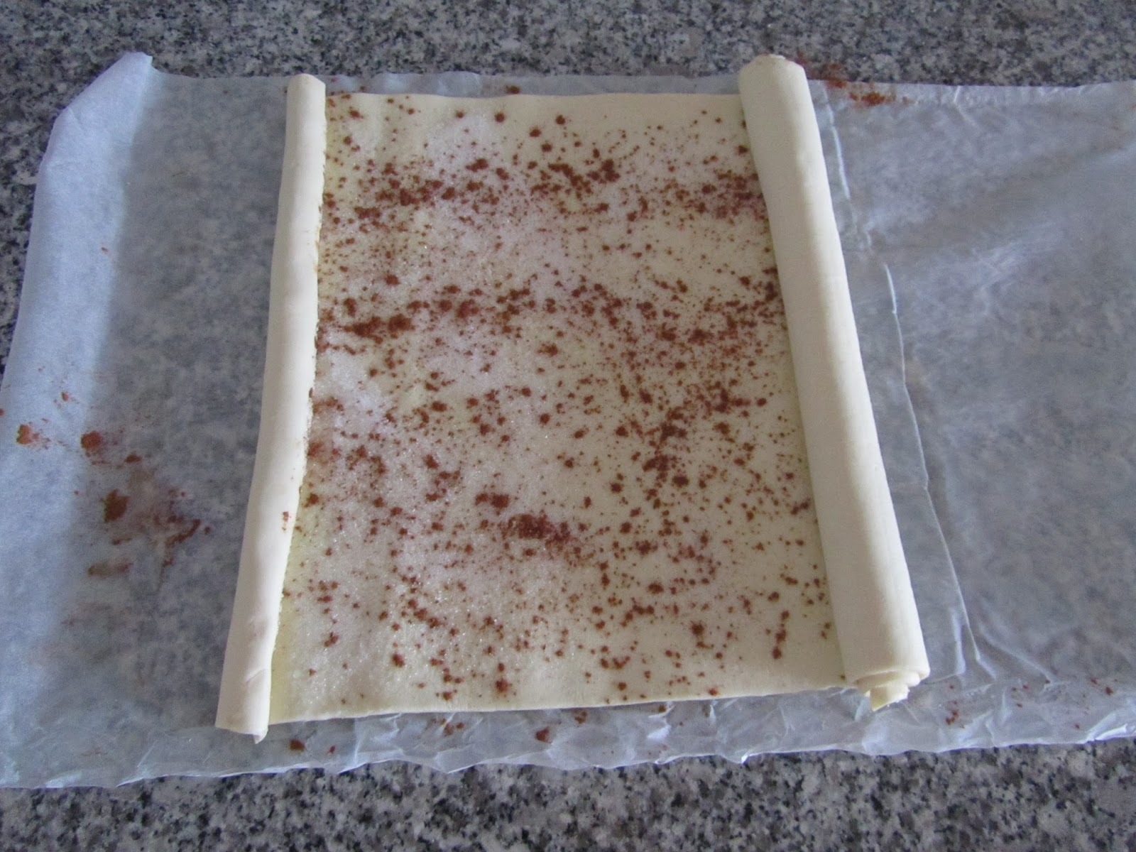 Desenrolar a massa folhada(1), polvilhar com o açúcar e a canela(2,3). Enrolar cada lado até meio(4), de forma a  se unirem e formarem um rolo(5). Virar o rolo(6) para facilitar o corte em tiras fininhas e colocá-las em tabuleiro forrado. Levar ao forno a 200ºC durante 12 minutos.