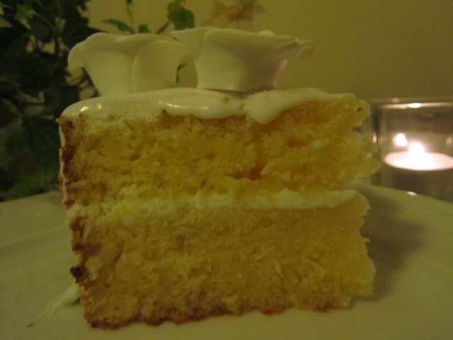 Este bolo de limão e coco é delicioso, fofinho e pouco doce.Usei-o para fazer o andar superior do bolo das Bodas de Ouro. Foi recheado com chantilly e coberto com pasta de açúcar branca. É o bolo ideal para acompanhar uma chávena de infusão de cidreira.